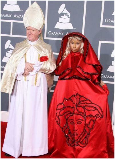 Nicki walked the red carpet in a blood-red hooded Versace creation designed especially for her and accompanied by a man dressed as a pope. Now really who would have thought of doing this? Theirs is good attention and then there is bad attention, but when you add Karma to the mix, well things can get pretty messy in your future.